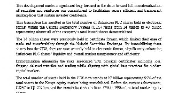 The 16 billion shares were previously held in certificate format, which limited their ease of trade and transferability through the Nairobi Securities Exchange. By immobilizing these shares into the CDS, they are now securely held in electronic format, significantly enhancing Safaricom PLC shares’ liquidity and overall market transparency and efficiency.